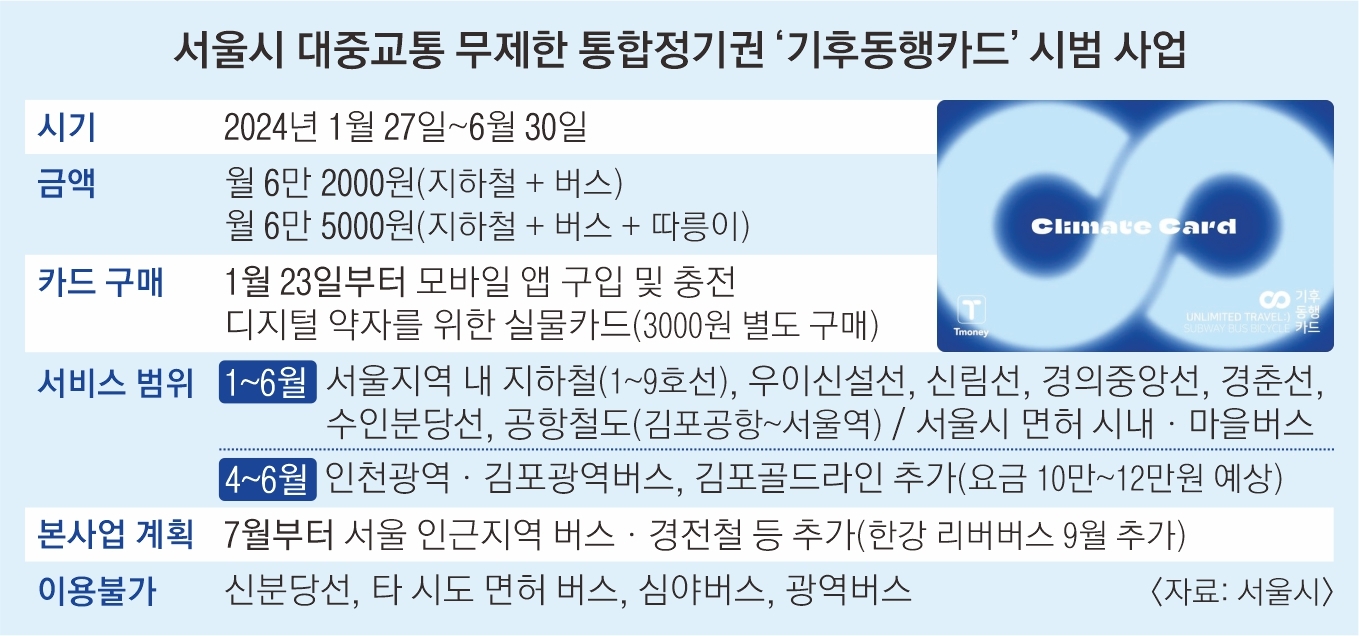 기후동행카드는 2024년 1월 27일부터 6월 30일까지 시범운영되는 서울시 무제한 교통카드예요