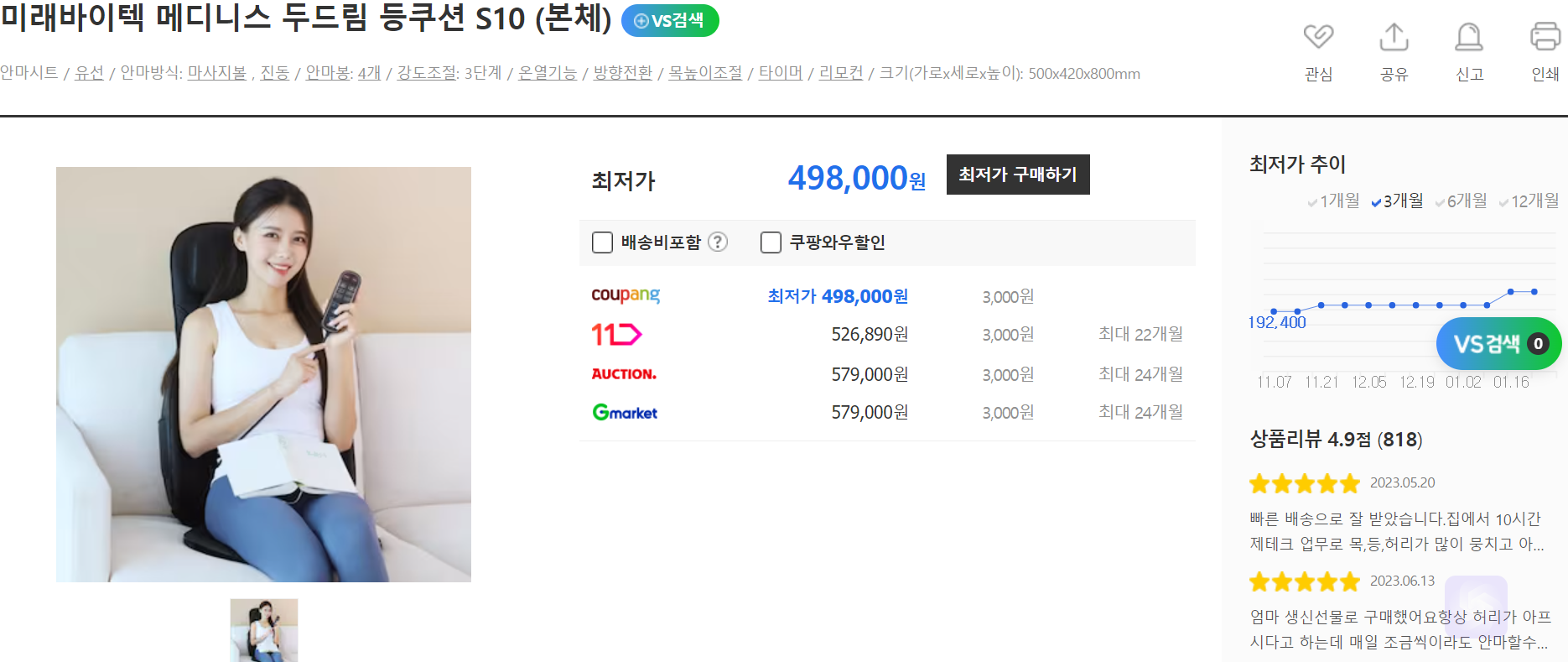 메디니스 쿠션 안마기 S10: 40~50만 원 대, 유선, 온열 효과 선택 가능, 목 높이 조절, 몸에 밀착되는 구조, 안마봉 4개, 다나와 평점 4.9