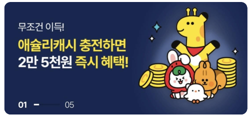 - 20만 원 충전 시: 최대 2만 5천 원 혜택(캐시 2만 원/애슐리 홈레스토랑 이용권 5천 원)