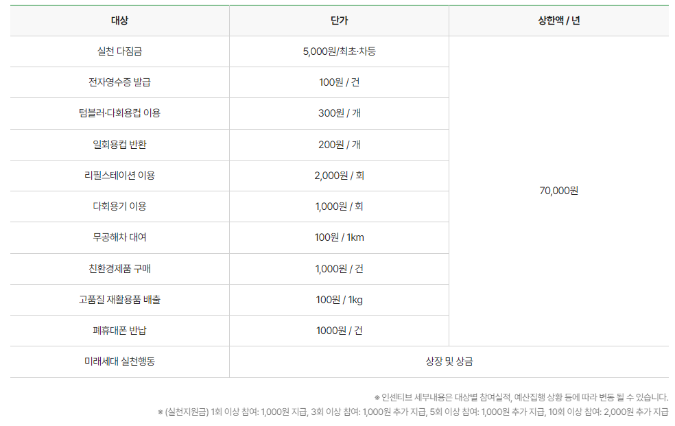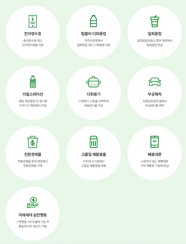 탄소중립실천포인트가 제휴된 사업장에서 전자영수증 발급, 텀블러/다회용기 사용, 일회용 컵 반환 등