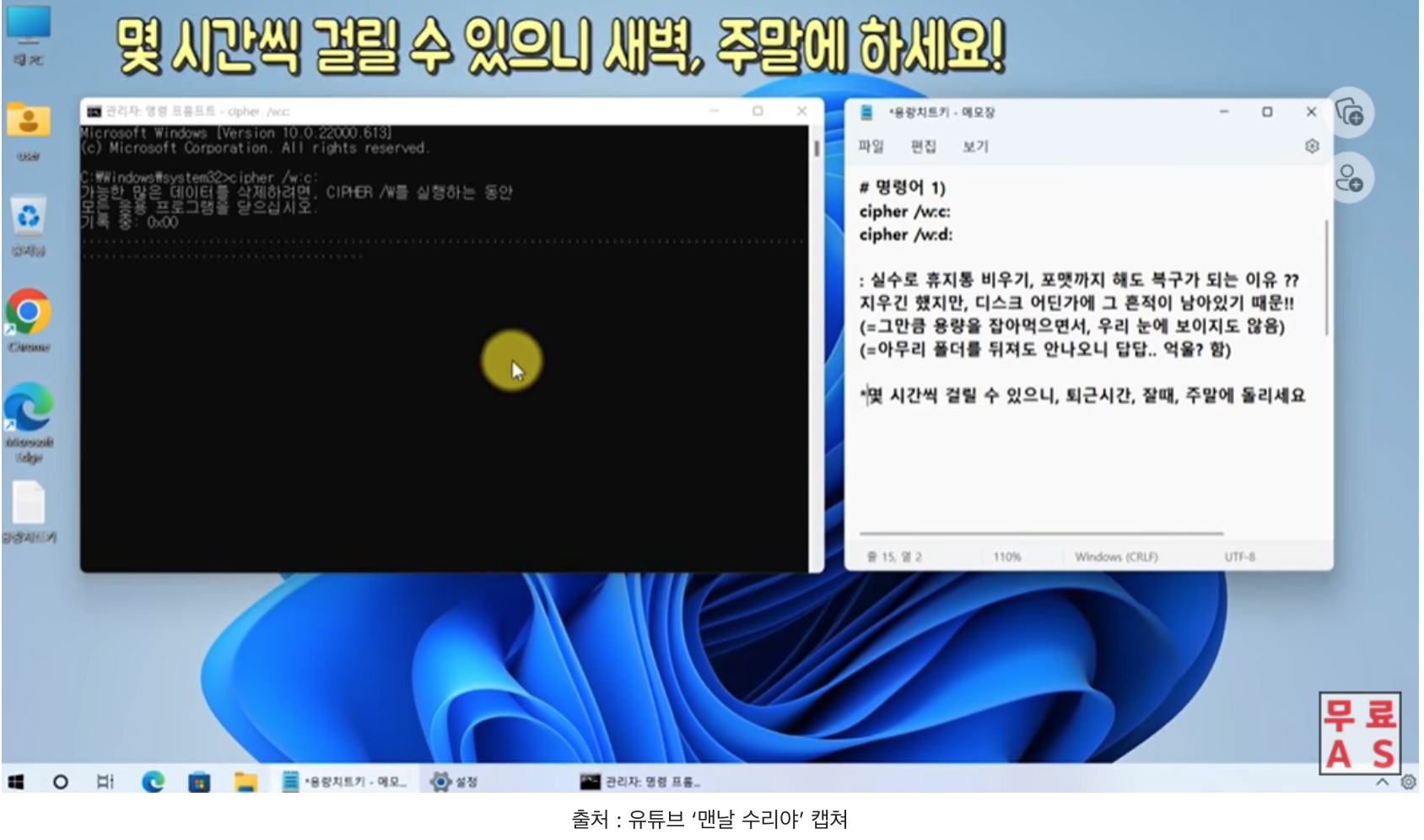 - cipher /w:c: 를 cipher /w:d: 로 바꿔서 C 드라이브가 아닌 D 드라이브를 정리해 주셔도 무방합니다.