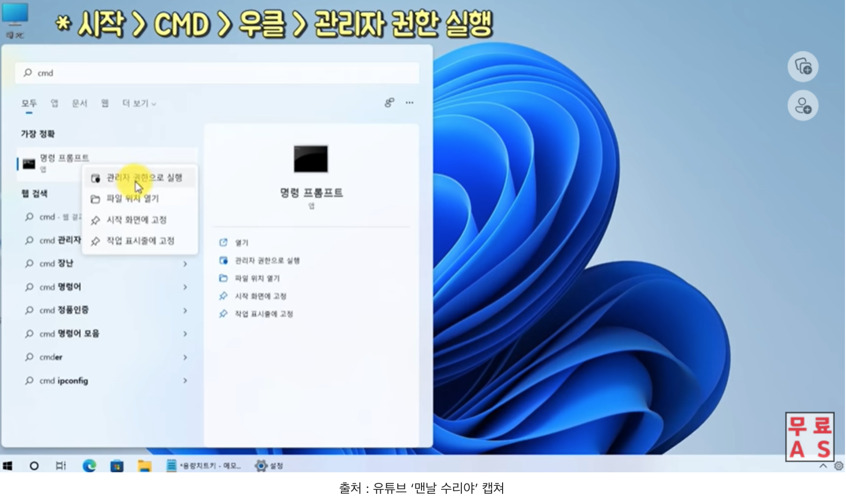 시작버튼을 누르고 cmd를 검색해 줍니다