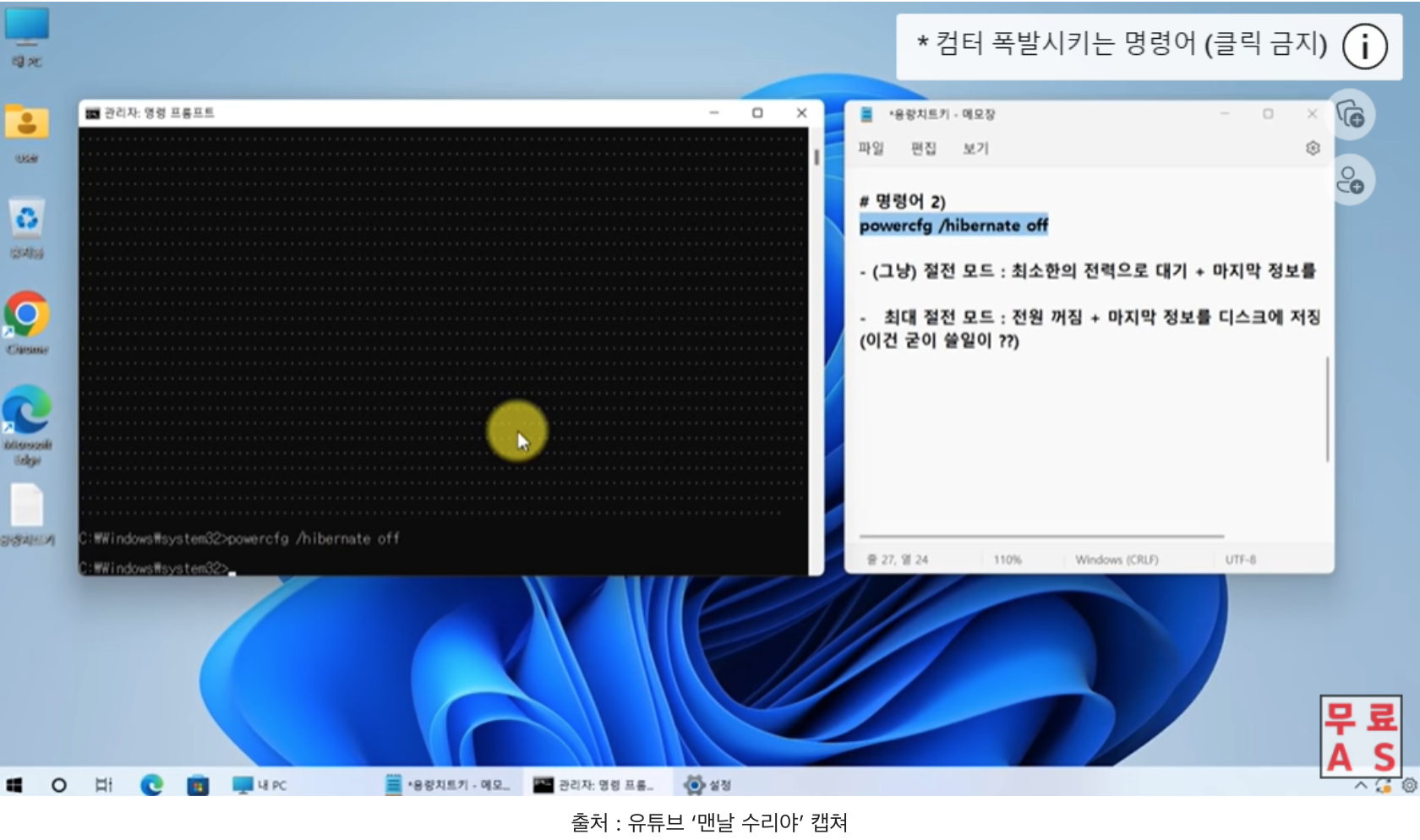 - powercfg /hibernate off는 최대 절전 모드를 끔으로써 용량을 확보하는 코드입니다.